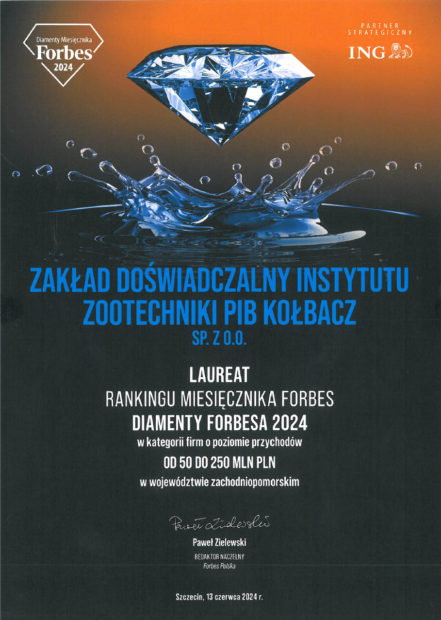 Zakład Doświadczalny Instytut Zootechniki PIB Kołbacz sp. z o.o. kolejny raz został laureatem rankingu miesięcznika Forbes – Diamenty Forbesa 2024 w kategorii firm o poziomie przychodów od 50 do 250 mln pln w województwie zachodniopomorskim.